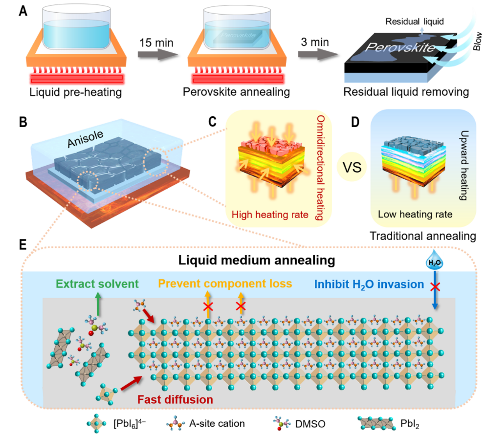 图1钙钛矿薄膜在液相介质中退火的流程及机理示意图