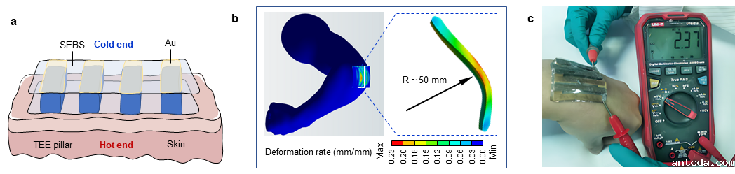 图3. (a) 贴附于人体皮肤上的面外π型弹性热电发电模块;(b) 通过有限元模拟分析弹性热电发电机贴附于人体手肘时的应变;(c) 面外π型弹性热电发电机利用人体皮肤和环境的温差产生持续的电压。